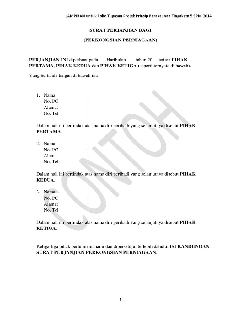 Ketika dua orang atau 2 instansi melakukan kesepakatan. Dengan adanya contoh, maka anda bisa membuatnya dengan lebih mudah karena hanya. Surat perjanjian saya yang bertanda tangan dibawah ini nama : Surat perjanjian bagi (perkongsian perniagaan) perjanjian ini diperbuat pada…. Contoh surat perjanjian yang baik dan benar dapat kamu gunakan sebagai referensi dalam menyusunnya.